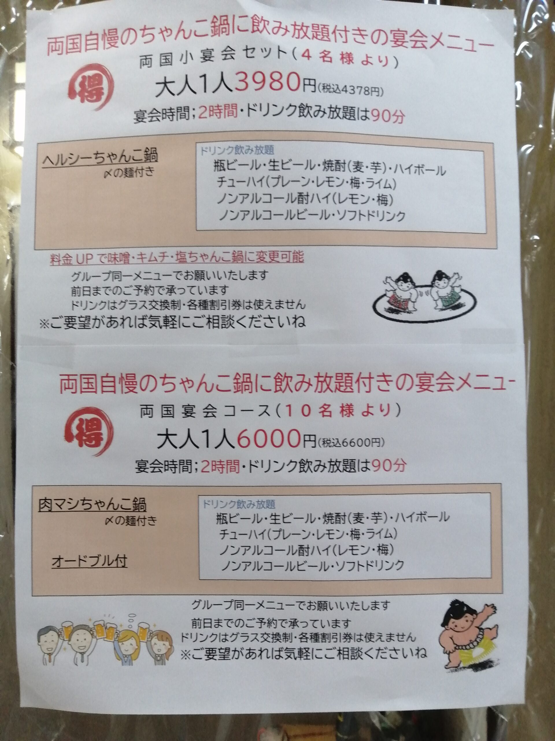 持ち帰りメニューですお弁当の個数が多い場合は前日までのご予約お願いしますき 季節限定のお弁当です。売り切れの場合はご了承ください 両国宴会コースですご予算などのご相談に応じてます。気軽に連絡くださいね ちゃんこ鍋のメニューです ご来店してからの鍋のご注文では時間がかかる場合がございますので、 電話での予約時に鍋の種類も決めていただけると有りがたいです。よろしくお願いいたします