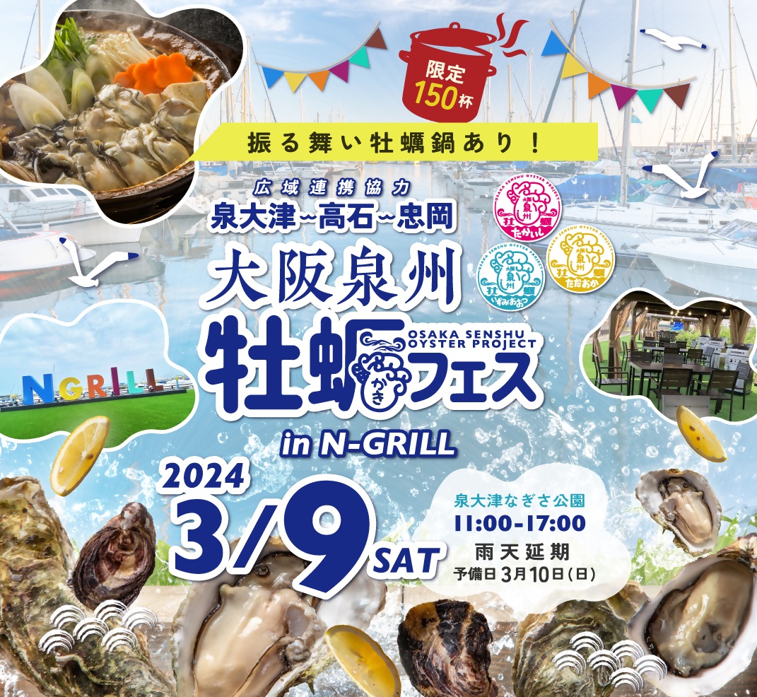 泉大津市の港のシンボル緑地であるなぎさ公園で、「大阪泉州牡蠣フェスin N GRILL」を開催します。