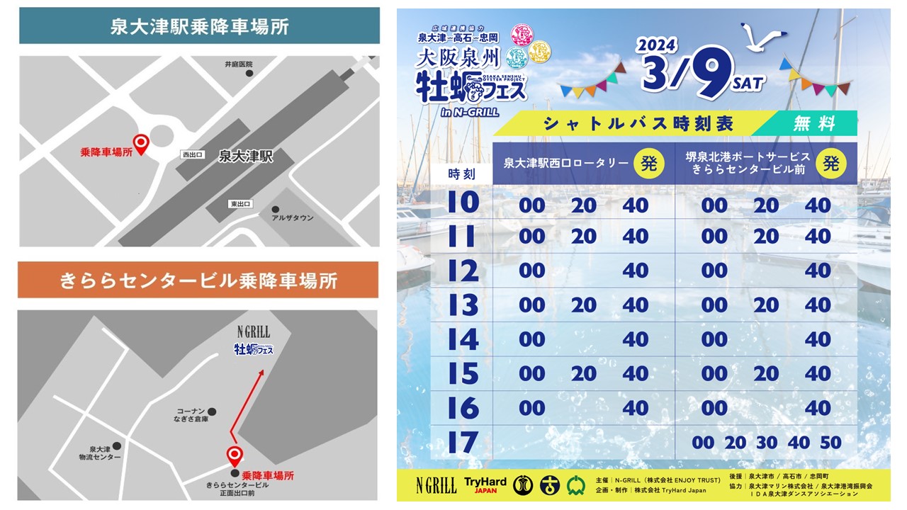 泉大津駅より20分間隔で無料シャトルバスを運行しておりますので、ご来場にはシャトルバスをご利用ください。