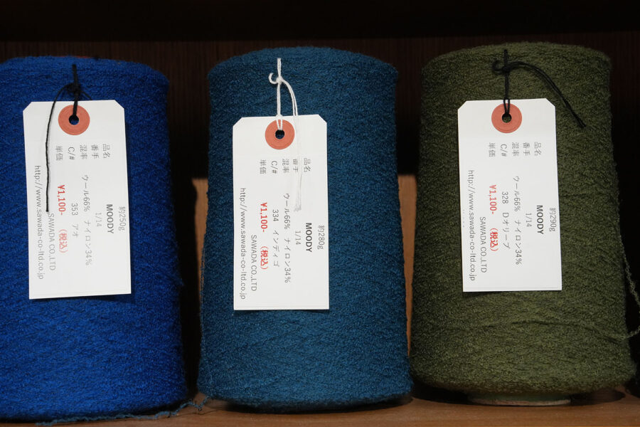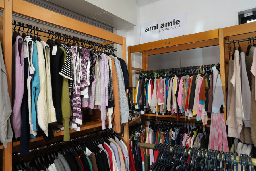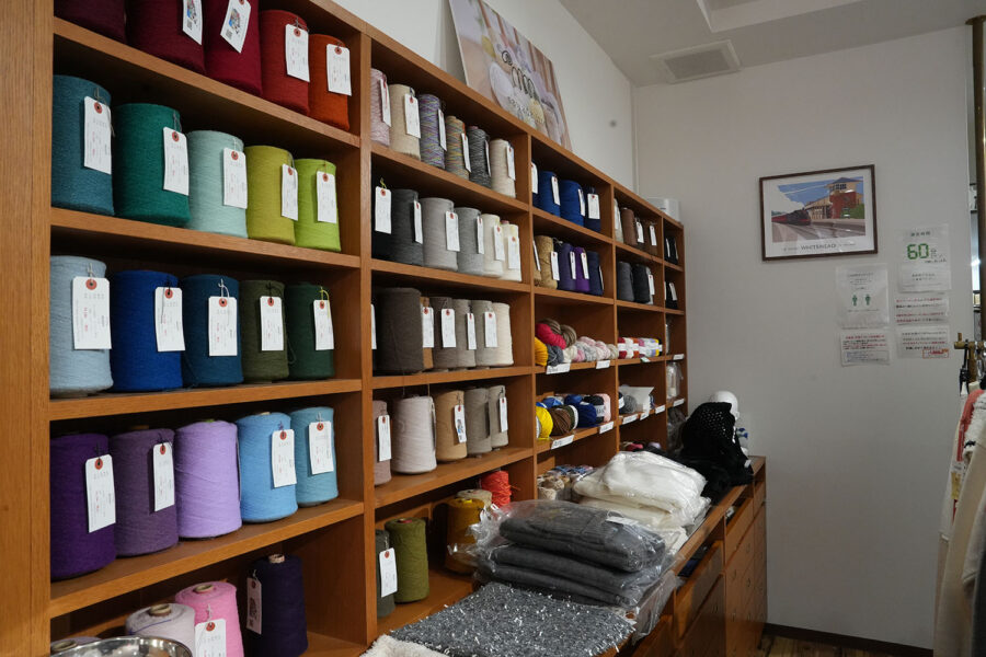 店舗に並ぶ商品は、大手アパレルブランド様向けの提案サンプルとして作られたレディースニットアイテムが中心で、ベーシックなデザインから個性的なデザインまで、糸メーカーならではの高品質な素材を使用した種類豊富なアイテムをご用意しております。