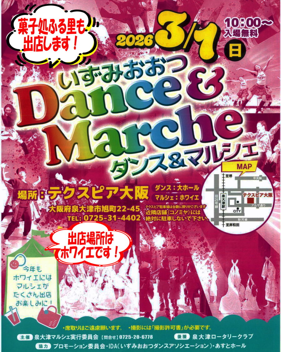 3月1日(日)テクスピア大阪の「いずみおおつ Dance & Marche」に出店します!(菓子処ふる里)